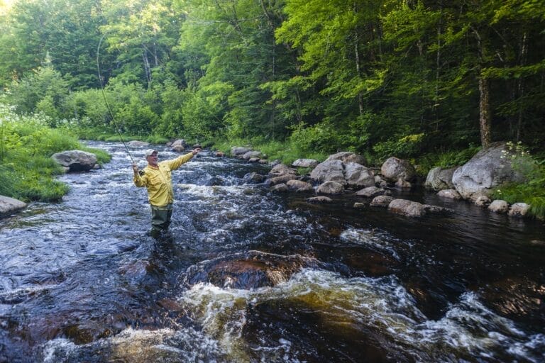 A man fly fishing for brook trout in Cold Stream in Maine’s Northern Forest. Cold Stream Forest, West Forks, ME.